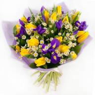 Букет «Созвездие» - это невероятно яркая и красочная цветочная композиция, которая состоит преимущественно из тюльпанов солнечного цвета и нежных фиолетовых ирисов. На языке цветов романтичные ирисы олицетворяют нежность и верность. Композиция выглядит еще более изысканно благодаря скромным невинным ромашкам, а также прекрасной упаковке и ленте, которые помогают подчеркнуть непревзойденный вид цветов. Такой букет вызовет неподдельный восторг у любого человека, а также поможет загладить вину перед любимым человеком.